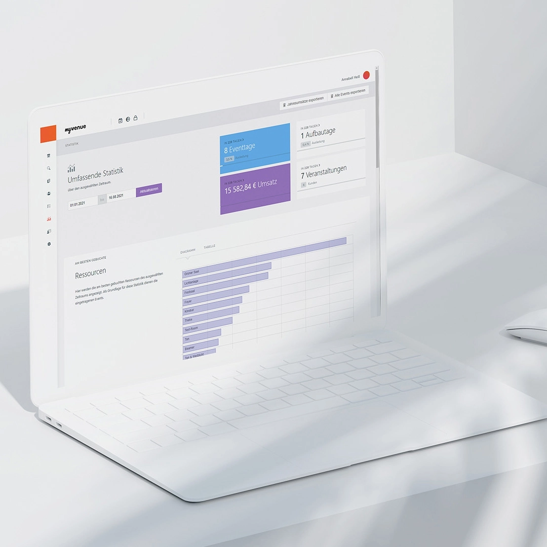 Durch die Buchung und Abrechnung in my-venue ist es möglich eine aussagekräftige Statistik abzufragen. Mit nur einem Klick lassen sich die Auslastung, Umsätze, ein Ressourcen-Ranking und auch eine Prognose anzeigen. Mit der digitalen Kundenverwaltung ist jeder Kunde stets verfügbar.