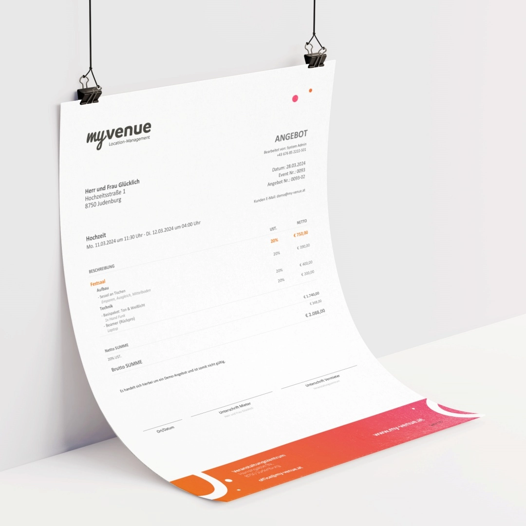 my-venue hat uns dabei geholfen, Prozesse zu automatisieren und die Arbeit erheblich zu vereinfachen. Wir können jetzt Angebote und Rechnungen mit nur wenigen Klicks erstellen und versenden. Unsere Arbeitsweise wurde dadurch erheblich effizienter.