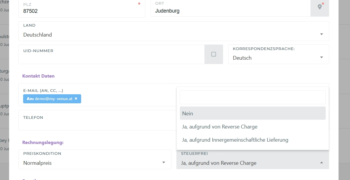Sie können nun steuerfreie Verrechnungen direkt dem Kunden zuweisen und die dementsprechenden Texte individuell auswählen. Diese Angaben werden automatisch bei der Erstellung von Angeboten und Rechnungen berücksichtigt.